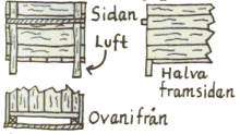 Av obehandlade brädor från isärtagna engångspallar byggde jag en stabil, bärbar låda (bredd 400, längd 600, höjd 350 mm). Jag lät hörnstolparna ligga utanför och gå ner 1 dm som ben så att lådan skulle få luft underifrån. Alla sidor och botten genomborrades med ett 3 mm borr med 5 cm mellan varje hål åt alla håll. Lådan försågs med ett lock och gångjärn.