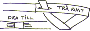 Lägg två bitar på varandra, vik dem och klipp ett hål genom båda. Ta den högra änden som alltid ska ligga överst, trä den underifrån och upp genom hålen och dra till.
