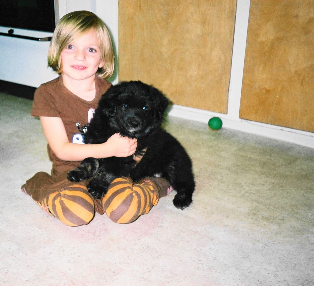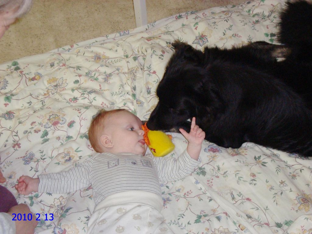 Hunden Freja bekantar sig med yngsta barnbarnet Amanda.