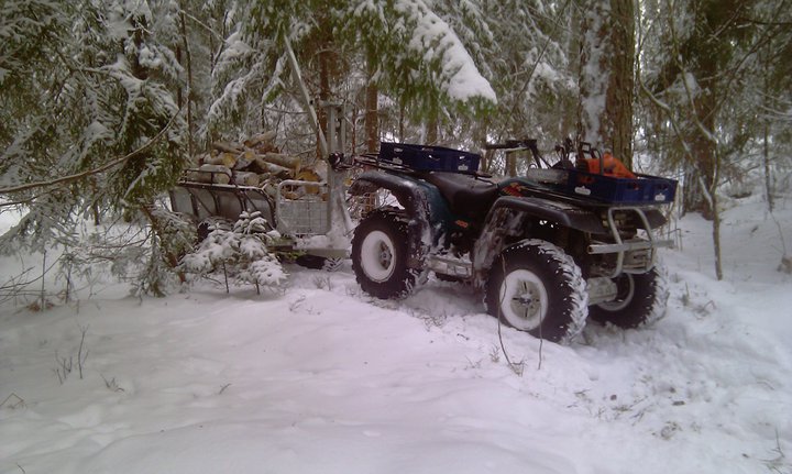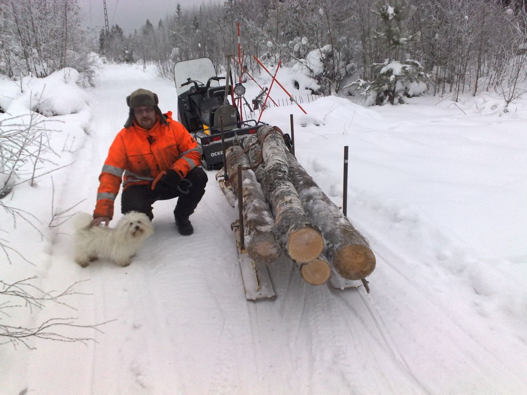 Gubben hugger veden med motorsåg och sedan skotar vi hem det med skoter och timmerdoning. Men i år sätter snön verkligen käppar i hjulet. Det är inte lätt att ta sig fram.
