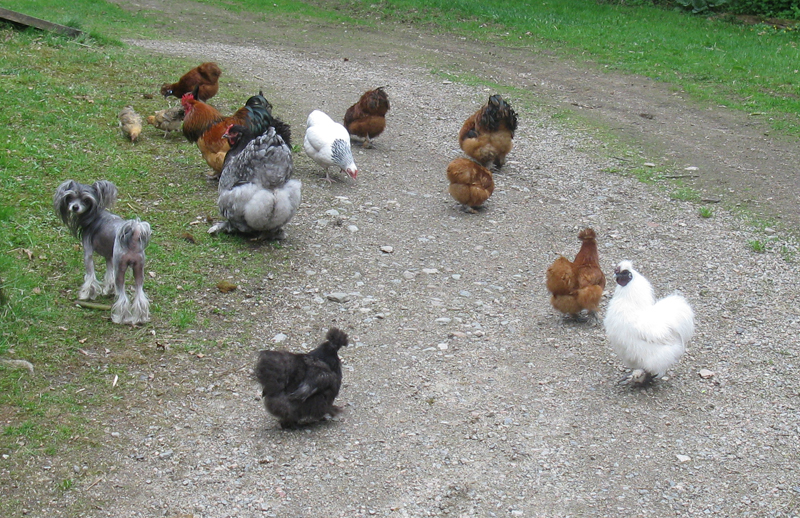 En hund bland hönsen....på väg mot kökstrappan och förhoppningsvis något gott