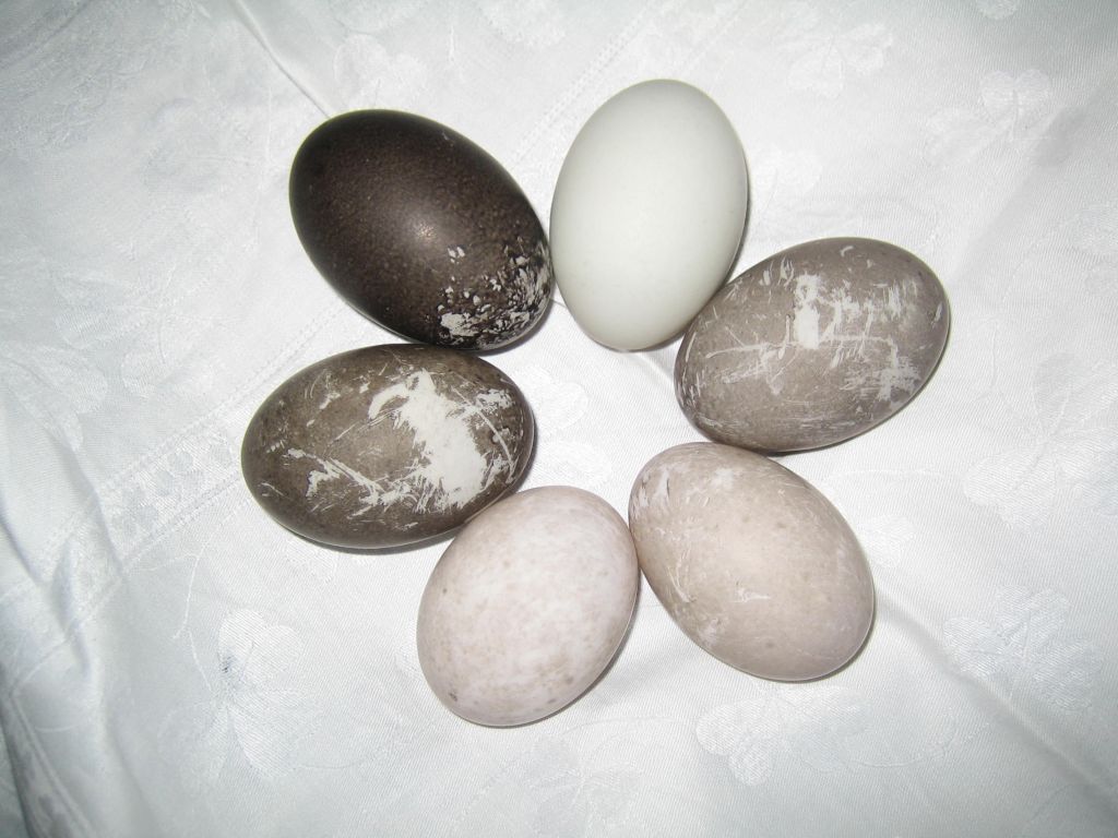 Har ett par SvBlå (svart) ankor som lägger svarta till grå ägg. Färgen lossnar vid tvätt om man gnor på en stund och då blir äggen blåaktigta.
