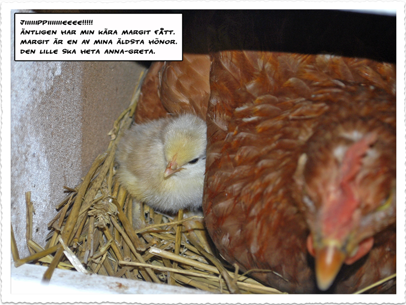 Äntligen har Margit fått kyckling. Hon är en av mina äldsta hönos som får för första gången. Jag är sååå lycklig..