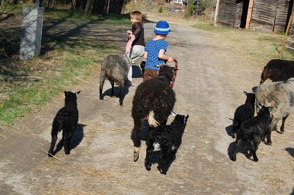 Betessläpp våren 2009. Ungarna och granntjejen lirkar ut tackorna (helsingefår) och lammen till vårgrönskan.