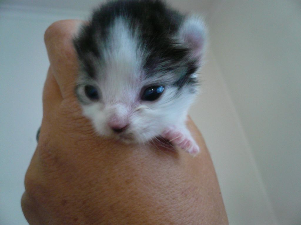 Min katt fikk 3 søte små - dette er en liten hona! Hun har nettopp åpnet øynene og lurer nok på hvem jeg er - skjønt jeg tror ikke hun ser så mye ennå. Søt i alle fall - og navnløs inntil videre.