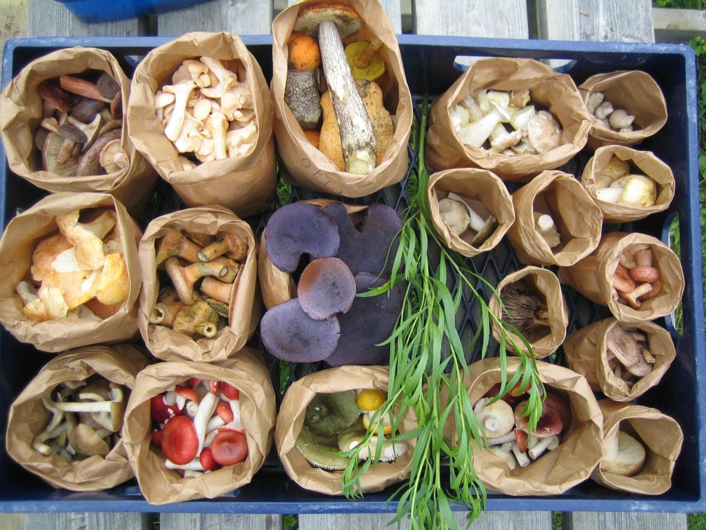Den blåvioletta svampen i mitten är violspindelskivling och klassas ej som matsvamp. En av kockarna använder den som dekoration. Jag laddar in en ny bild i galleriet på svampen. En riktigt vacker sak.