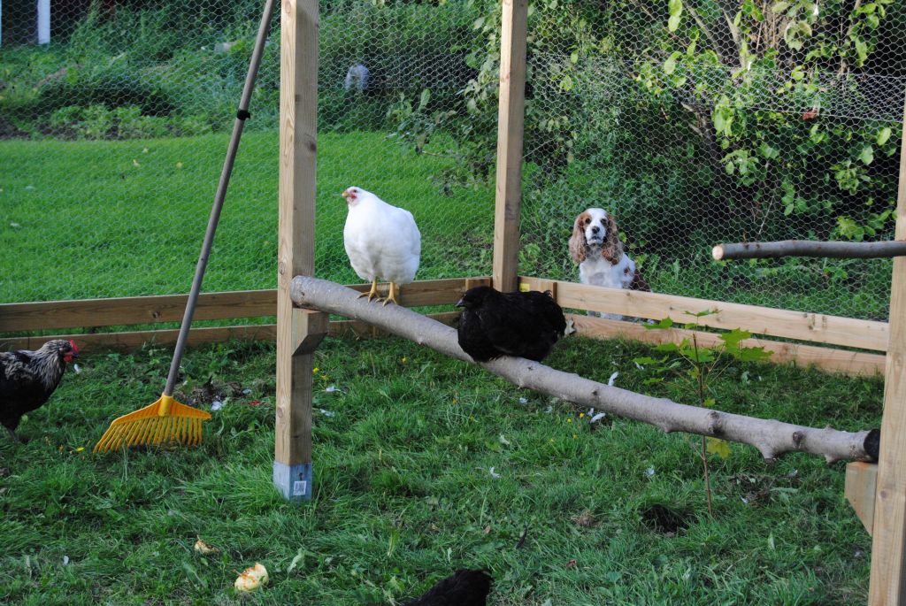 Smilla vill så gärna komma in och "leka"  lite med de små hönsen. Hon sitter troget utanför varje dag och väntar på att få slinka in.