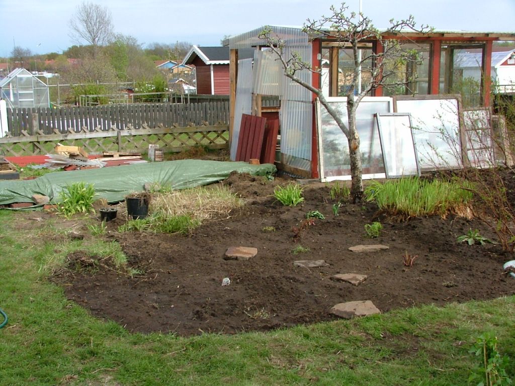 Min man börjar omorganisera växthuset. Bort med plasten på sidorna och anpassar storleken efter de fina fönster som satt där. Själv börjar jag försöka hitta och inte förstöra gömda växter i trädgården. Allt blir ju inte i år som jag vill ha det för jag vet ju inte vad allt är för växter vad det är för färg, höjd mm