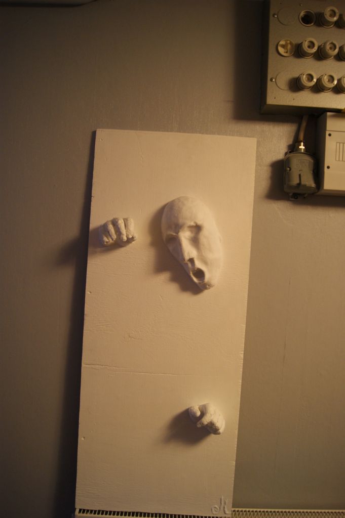 Så här blev då alltså reliefen! Några av fingrarna råkade jag hugga loss när jag högg ut dem. Men när det händer är bara att limma fast dem igen med trälim! Nu står den i mina föräldrars källare, men de är tänkt att den skall vara målad i samma färg som man har på väggen. (Där jag hade den utställd var det vitt) Plankan som jag monterat ansiktet och händerna på hade jag hittat i en vrå av en verkstad. den hade använts när man borrat, vilket syns på baksidan!