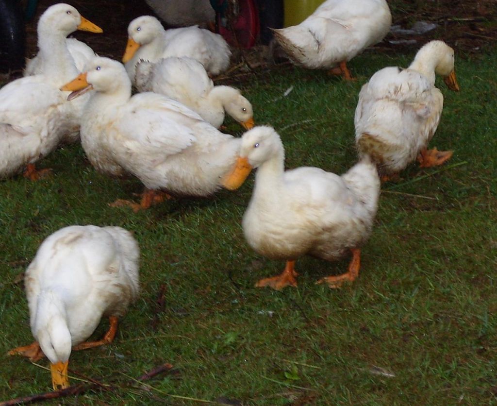 Några av mina fina pekingällingar. Växer bra, blir ganska stora, lägger många ägg. En mycket bra ras för självhushållning. De är mycket tama, lätta att valla dit man vill ha dem. Kommer springande när jag skakar fd godislådan som jag mäter upp fodret med, eller om jag kallar på anke-pankorna    .
