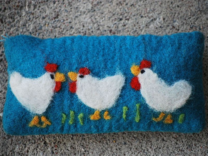 Är man hönsmamma så är man.. Pennskrinet köpte jag efter ett antal misslyckandes med symaskinen. Blixtlås är ett himla knepigt påhitt.. Hur som helst så satt jag med tovnålen det blev såklart hönor igen..