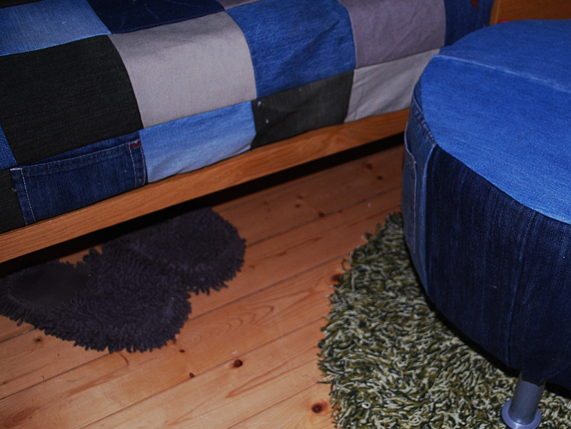 Jorå.. Farsan köper jeans lika ofta som jag städar mitt hönshus. När han sen ska rensa så har jag en väldans massa brallor att pyssla med. Innan symaskinen pajade så han jag sy en bit på min lapptäckessoffa samt göra klart en sittpuff med farsans brallor..