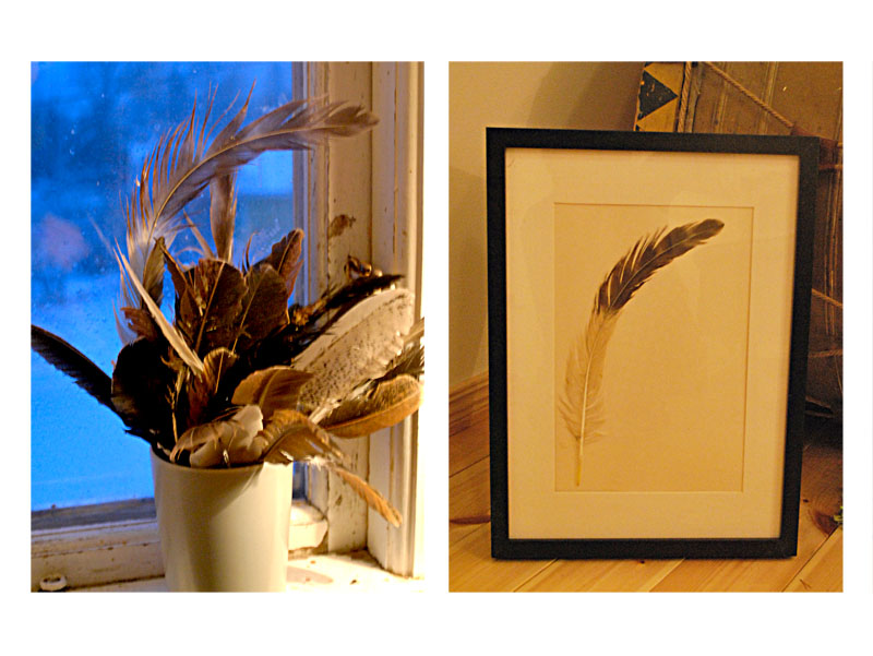Jag har också en mugg med fina fjädrar stående hemma! Precis sådär, fast jag fick ställa in min i vitrinskåpet för katterna var alldeles för intresserade av dem. Finfin idé med tavlor!