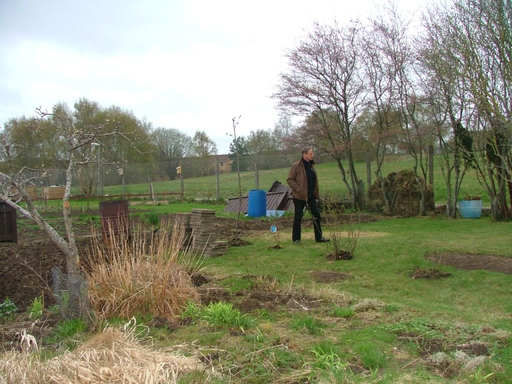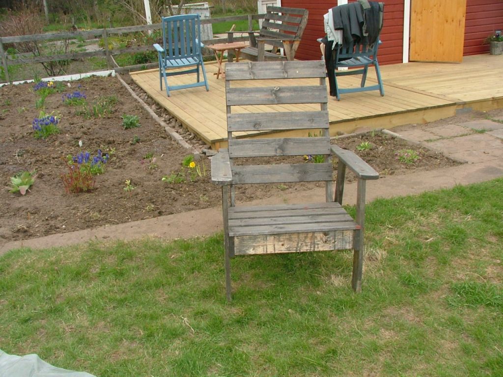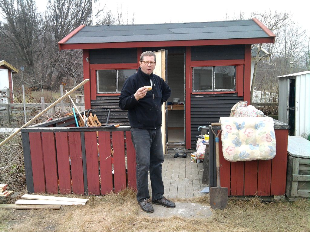 Min händiga man njuter av lite enkel förtäring  Sen skall här röjas! Verandan är genomrutten för någon smarting trodde att man kunde ha svarta plastsäckar som skydd för ogräset under trallorna
