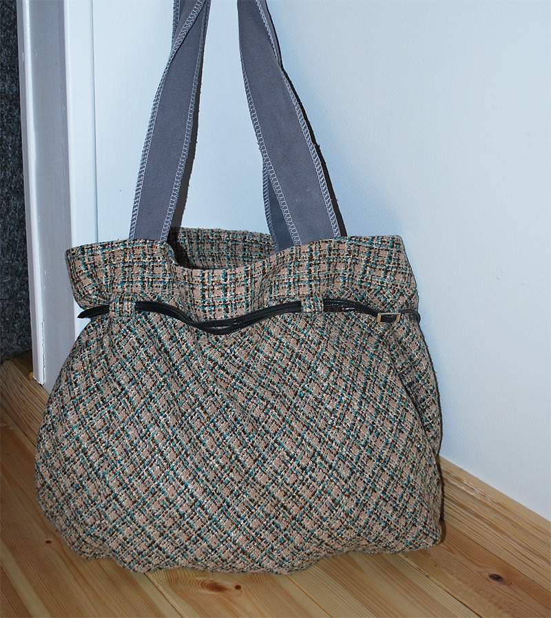 Nu är jag riktigt varm i symaskinen.. Det här är morsans gamla kjol som jag klippt ner och sytt en verra av.. Handtagen är från ett par kortymbrallor. De fiffiga var..tyckte jag..att man kan dra åt väskan me skärpet..