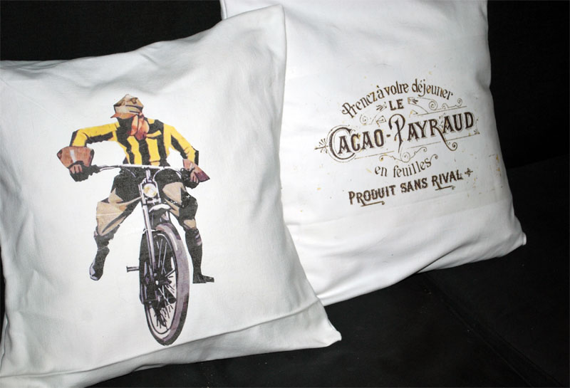 Tyget är ett gammalt linnelakan. Den ena bilden är en gammal tysk reklam annons som jag skalat av och gjort om lite. Den andra är en fransk tvålreklam tror jag. kuddarna är till min morbror Rolf.Han kan ju inte ha mormors blommiga tantkuddar ju.. Hoppas han gillar dom hära..