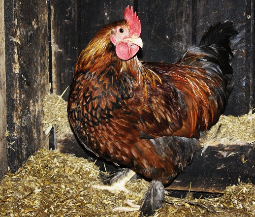 Röd tupp med kantteckning (halvtaskig kantteckning  ). Något större byxor önskas.