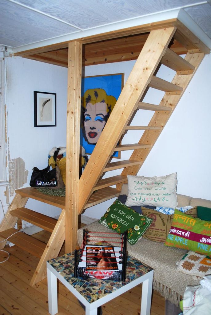 Så här blev lösningen i mitt hus. Jag har en trappa på utsidan oxå men det blir lite kallt när man ska gå å kissa på nätterna. Sen så var den öppna spisen i vägen så det här var det enda sättet att göra en trappa på.. Men de funkar för mig..