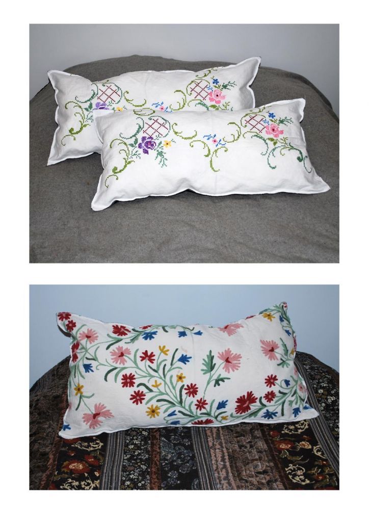 Bilden under är en gamal duk som jag sytt om till 2 kuddar.