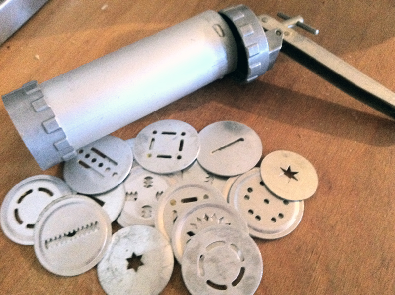Ååå, en kaksprits! man trycker mördeg genom plattorna och får roliga och goda kakor!