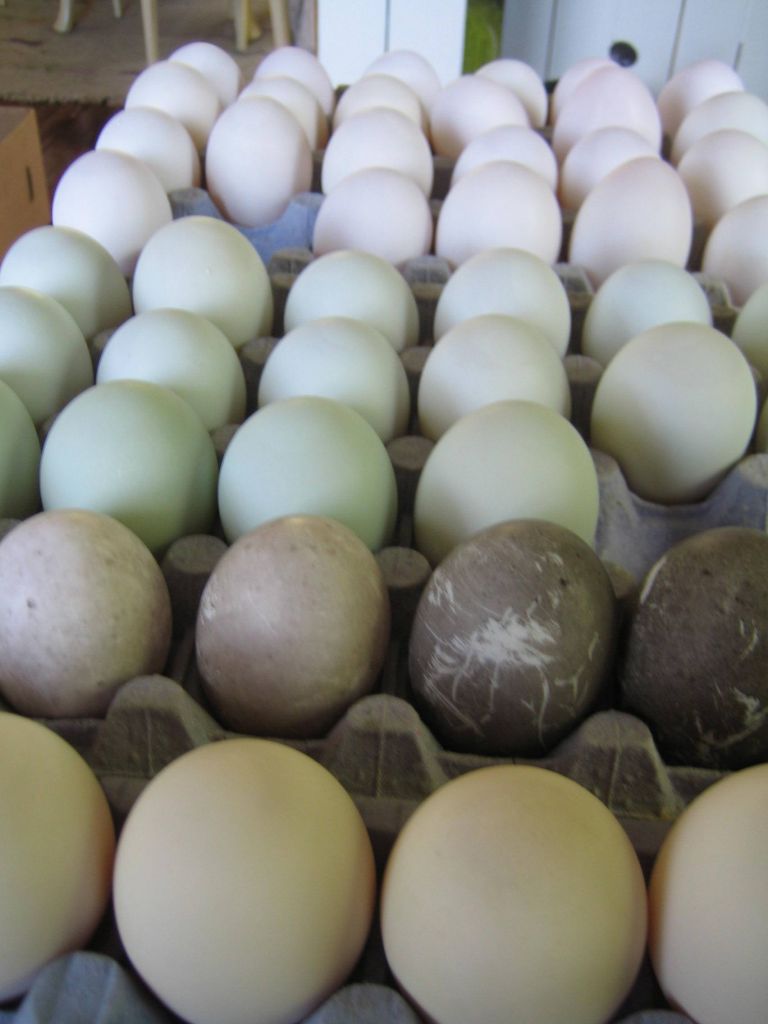 En del ankor och framför allt då Cayuga har dessa anlag. Tvätta dom väldigt försiktigt innan du säljer dom, färgen kan ju skrubbas bort. Restaurangerna betalar bra för olikfärgade ägg. jag blandar alltid färgerna i mina kartonger.