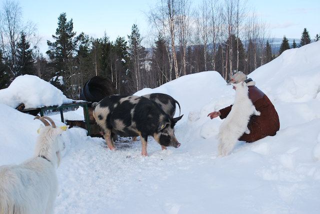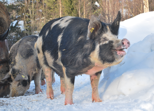 Linderödare som utegångsgrisar i Lappland, som ska grisa inom kort. Halmfyllda hus fri tillgång på grovfoder, plus potatis och korn, salt, mineral och dagligen mänskligt umgänge. Ger tama trygga svin och människor. Getar´n