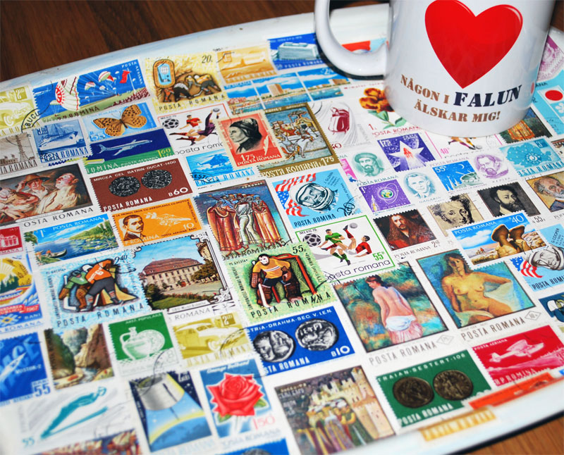 Det här är en gammal bricka som jag målat om några ggr.Blev inte nöjd osv..Sen så kom den fram idag och jag fick en ide. På min loppis där jag är stam kund så hittade jag en hel påse med frimärken som nu kom till användning.Mormor som gillar frimärken ska få den här brickan.. Hoppas hon gillar den..