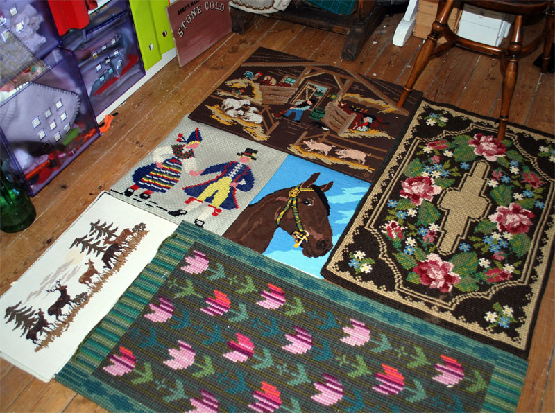 Det finns sådana fantastiskt fina broderier som säljs för knappt en tjuga på loppisar. Jag försöker att pussla ihop en massa till en tjusig matta istället.. Blir nog bra så småningom. Den längst ner till höger me tulpanerna har farmor broderat..