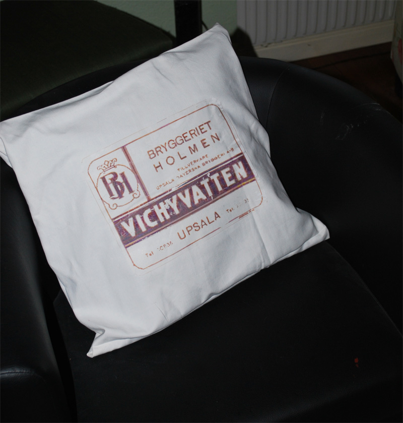 heh..hmm..ja kära vänner..Jag är insnöad idag så mera kuddar är på gång. Ett Alternativt kuddkrig kanske..?? någon??..=) Den här är till min mormor.Hon kommer från uppsala så jag tog en gammal läskedryksettiket och tryckte på en kudde som jag sytt av ett linnelakan..
