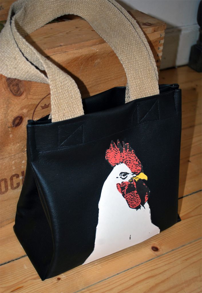 Jaa kära vänner.Nu är jag rejält insnöad.Ute oxå för den delen. Men jag har sytt en verra som ni ser och sen ville jag ha min älskade lille tupp på framsidan. Men mina screengrejer har inte kommit så jag har bara klistrat på honom. Men är nöjd endå tror jag.Tyget är något slags skinnimitation som jag fick av morsan.Hon skulle klä om några stolar som aldrig blev av.(har 3 rullar..hoho) Sen äre något gammalt band från morfars tid.Jag tror han använde det till å flytta piano eller va mormor snackade om.Men nu är det handtag..