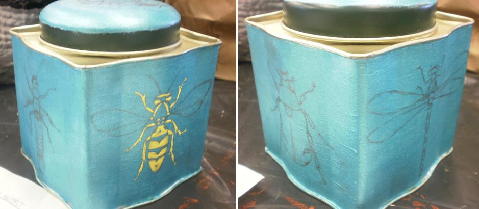 Här ser du skalbaggen, trollsländan & en scolopender jag gjorde på 2 st av sidorna & på locket.