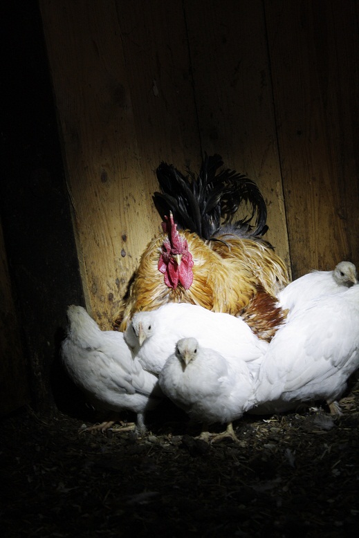 Mamma höna har stött bort ungarna så nu har han tagit över vårdnaden.