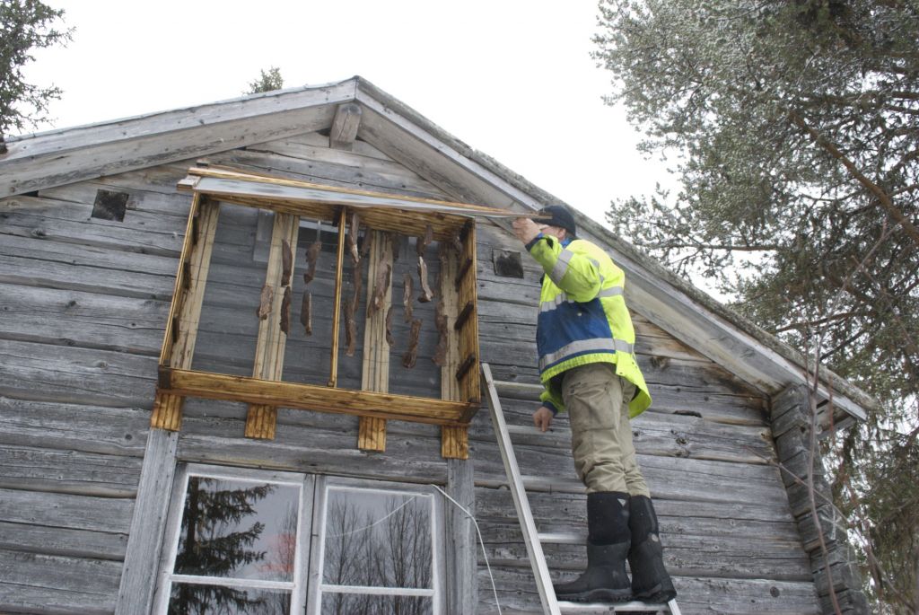 Soltorning av kött och fisk i mars, på österväggen av gammalt timmerhus.