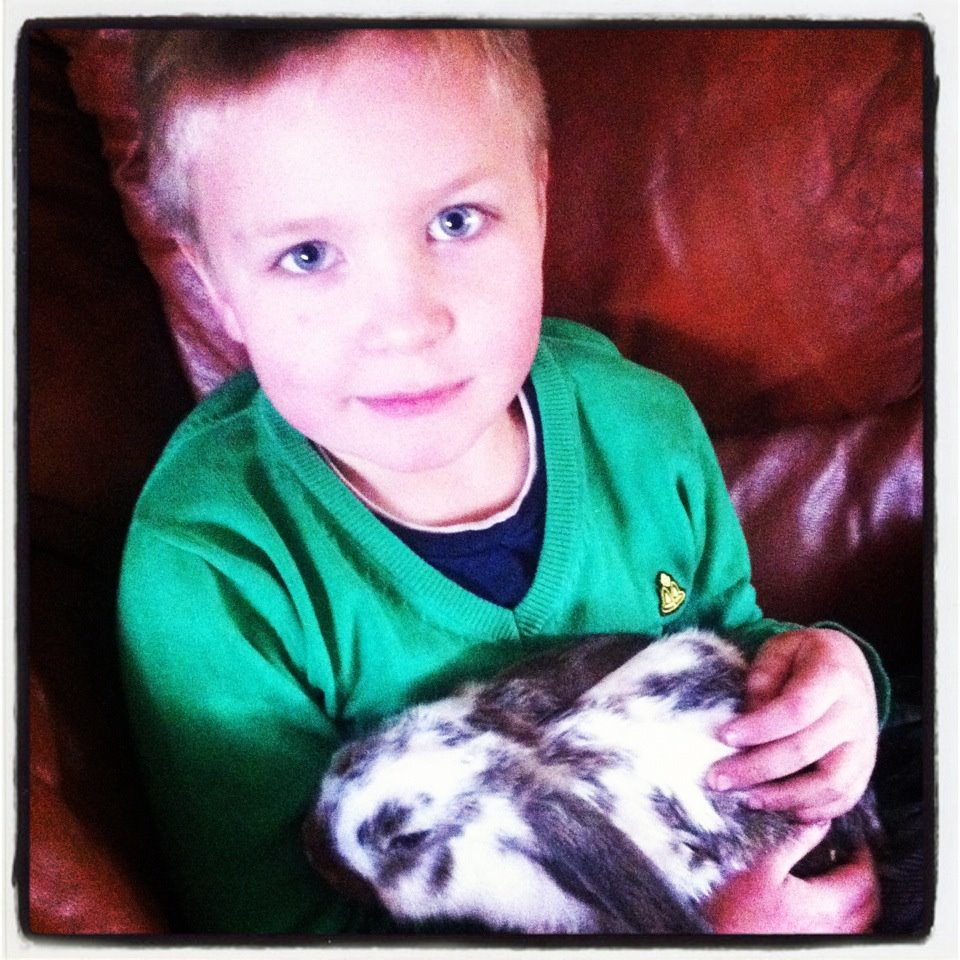 Här på bilden med sin av våra nya kaninungar korsning mellan Belgisk Jätte och Vädur.