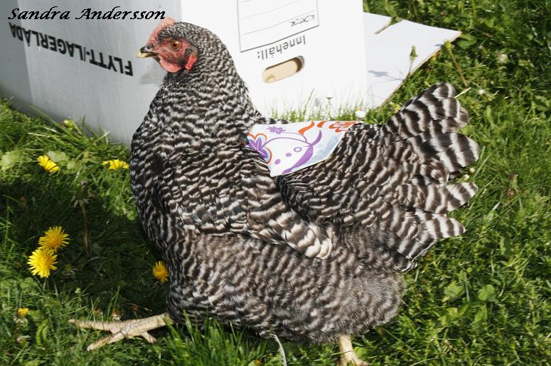 De första storlekarna blev för små för de tilltänkta hönorna men nu har jag fått ihop en mall som passar till större hönor. Plymouth rocken fick agera som modell till dessa.