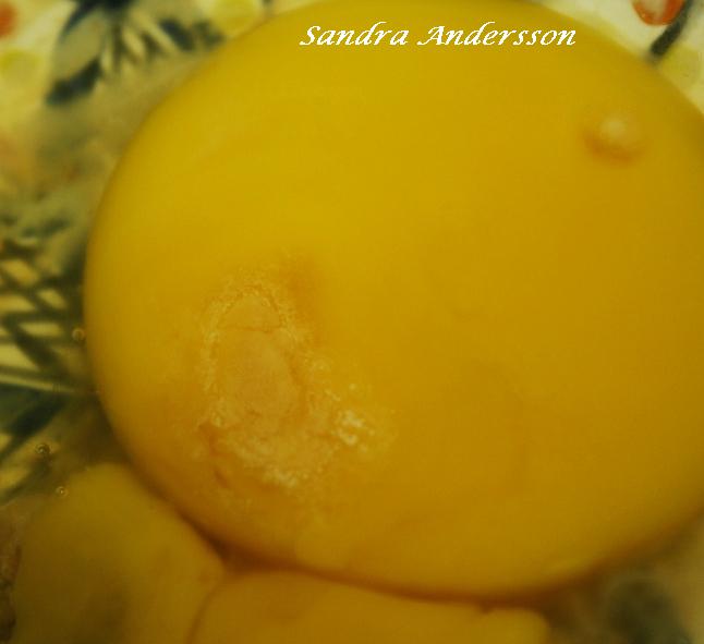 Detta ägg var befruktat men stannade av i utvecklingen innan några blodkärl hunnit börja bildats. Vid genomlysning såg detta ägg obefruktat ut. Vill påminna alla med denna bild om att det kan vara värt att knäcka o kolla ägg man tycker ser obefruktade ut. Vet en del som fått folk på sig som köpt ägg skickade på posten att ägg varit obefruktade men det behöver ej vara så. Utan äggen kan ha varit befruktade och stannat av i tidigt stadium pgd. av att de skadats i posthanteringen men kan även bero på andra grejor också. Risken för att detta händer lär iaf. öka med ägg som skickats. <br /><br />Pricken längre upp lite snett till höger är ena äggsnodden och har inget med befruktning att göra. Groddskivans utveckling (Celldelningen) som börjat ser ni som ett större området.