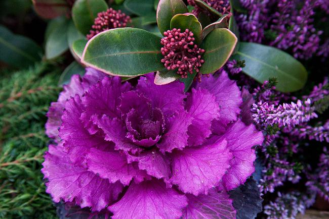 Olika vackra blomsterarrangemang ute i bäddar, trädgårdsland, rabatter m.m.