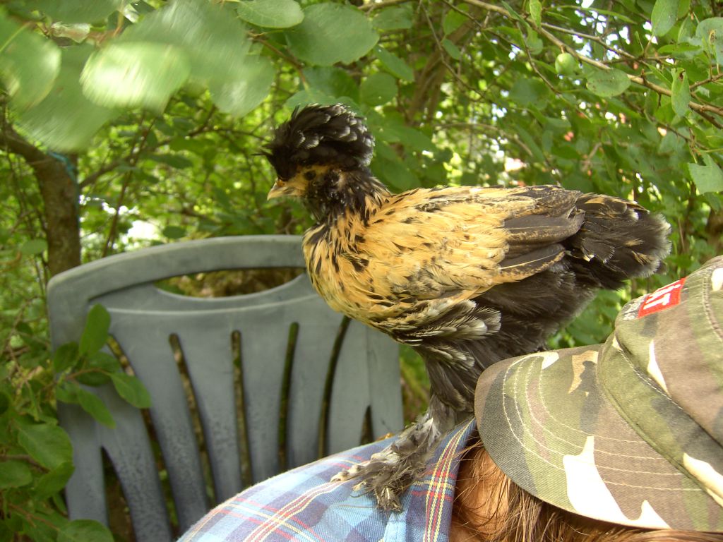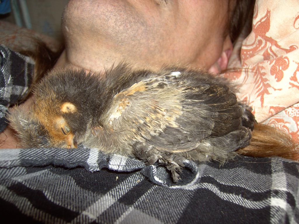 Pavlovskaja kycklingen Ivan (blivande tupp?) tar sig en tupplur tillsammans med husse.