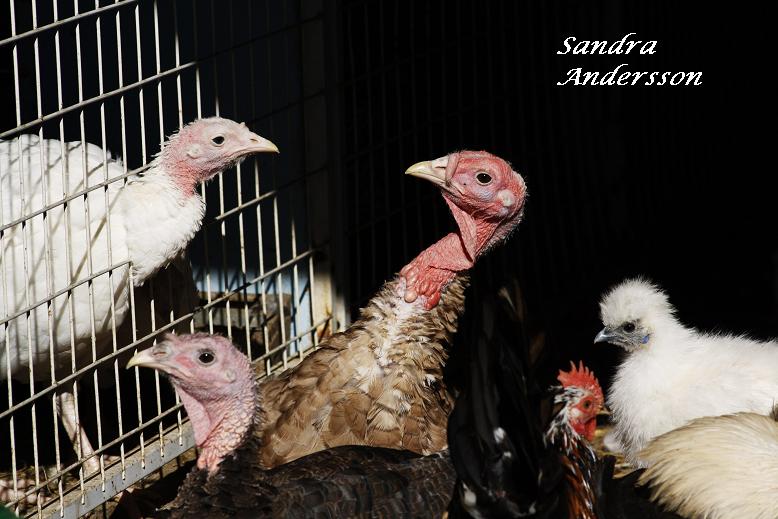 Hon ser snäll ut men denna Crölledam (kalkonen till vänster bakom galler) är en riktig muckartjej. Här har hon gett Ingvar ett nyp i ansiktet så han ryggar tillbaka.