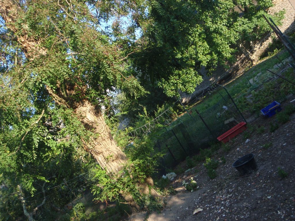 Det finns en stor falsk accacia som ger föder till höns och till jorden. Vi har stängde en lite ytan vid rot systemet och gjorde en grönsak trädgård dit.