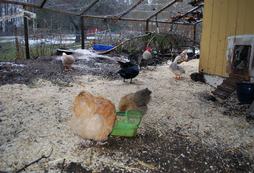 Imorse höll jag på att slå ihjäl mig när jag skulle öppna luckan. Troligvis hände samma sak för Alexander.. Så den här sidan som inte är undertak har jag nu lagt spån hela vägen. Kommer bli ett helvete att ta bort det i vår men hellre det än att nån halkar eller jag.. Kanske lättare att spärra av den delen som inte är under tak..hmm