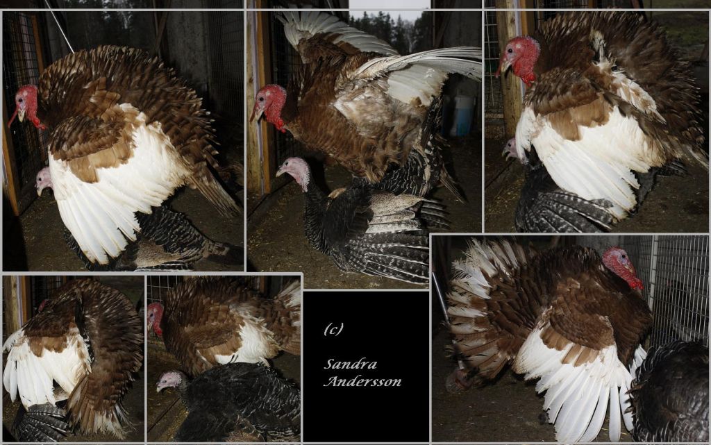 Efter en del tömning av gaser i krävan och matande med proviva nyponsoppa i ca 5 dagar så är kalkonen jag var rädd för skulle dö helt återställd. Han äter normalt själv igen, han bajsar normalt, han mobbar ankorna igen , han spelar och igår var han till och med så pigg att han bestämde sig för att "bli man" när jag släppte ut de ... Första gången jag sett de para sig och tror det var jag som utlöste det på något vis (?)... Berit verkar tro att jag är tupp ... Hon lägger sig för mig . Blev först rädd att det var något fel på henne istället för det gick inte att resa henne upp, man kunde lyfta henne och hon "låg" i lyftet, som en staty. Efter en stund kom Ingvar och kollade nyfiket på henne, började krafsa lite försiktigt på henne och sedan klev han plötsligt upp ... Och idag hade jag med mig kameran för att försöka fånga händelsen, om de skulle göra det igen. Och det gjorde de ... Idag var Ingvar dock mycket mer intresserad, han verkar ha kommit på hur han ska göra. Däremot Berit ville inte lägga sig... Inte förrän jag kom och ställde mig bredvid, då la hon sig på en gång för mig (knasfågel!!) och då passade Ingvar på och snabbt kliva upp. ![]() Hoppas de båda håller sig friska och krya nu så man kan få lite bäbisar efter de senare som det var planerat! Hum ... Ser tungt ut för stackars Berit. ![]()
