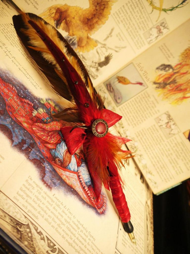 Fjäderpenna med pennstift som man doppar i bläck. Dom är till salu, pris beroende på arbetstid, typ av fjädrar och material Den här säljes för 320:- inklusive frakt~