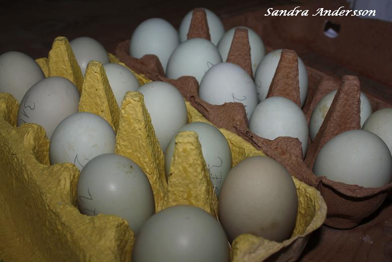 Äggen är avelsägg. Äggen märkes datum de är plockade, sedan vad för ras det är och ev. färg. Dessa ägg har ej jag märkt utan säljaren. Men jag brukar också märka de jag plockar, iaf. när det gäller avelsägg som ska skickas iväg till andra så jag inte skickar iväg fel sorts ägg.