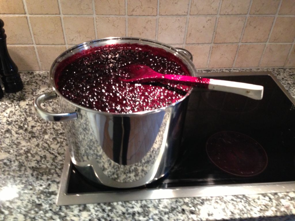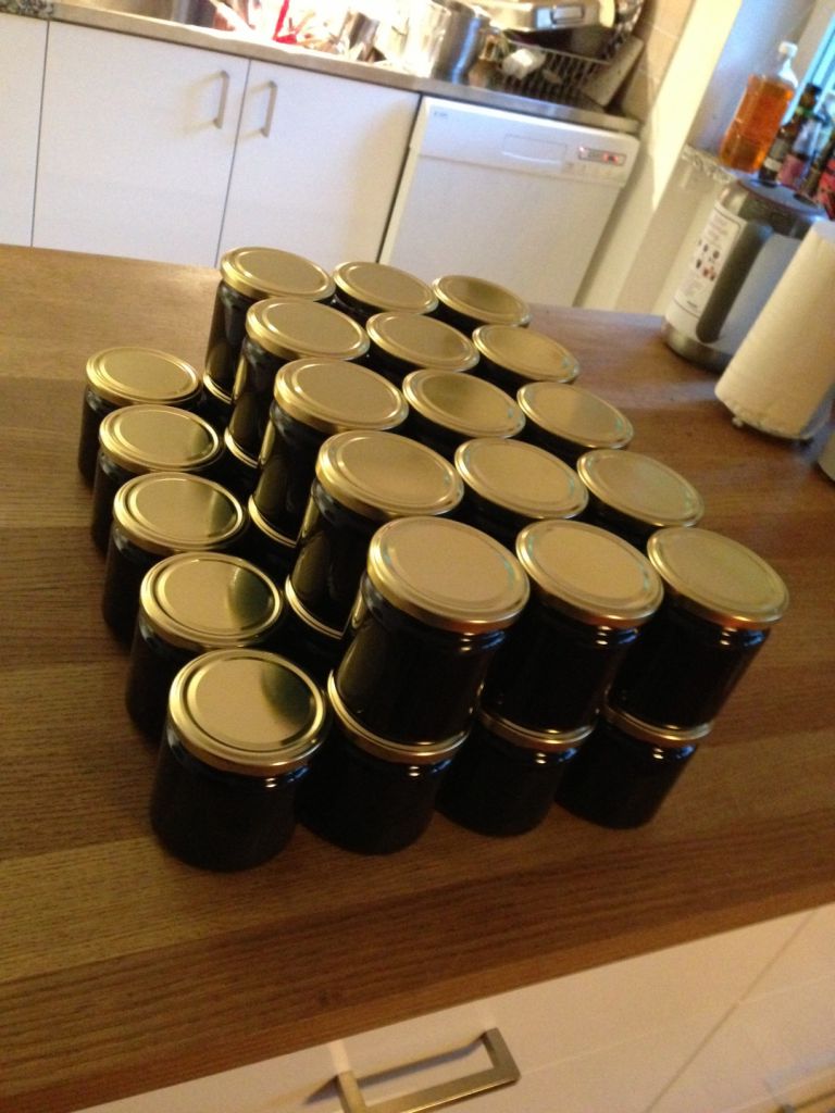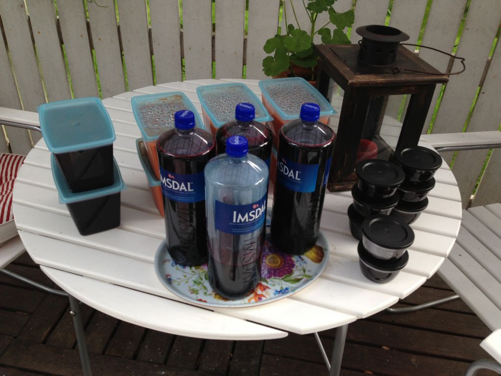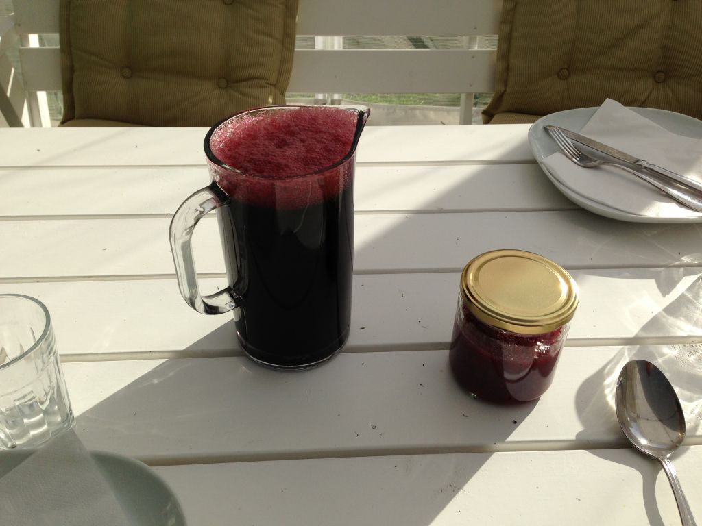 Flaskorna är blåbärssaft. Småburkarna är blåbärsgelé .. (vad man nu skall ha det till).