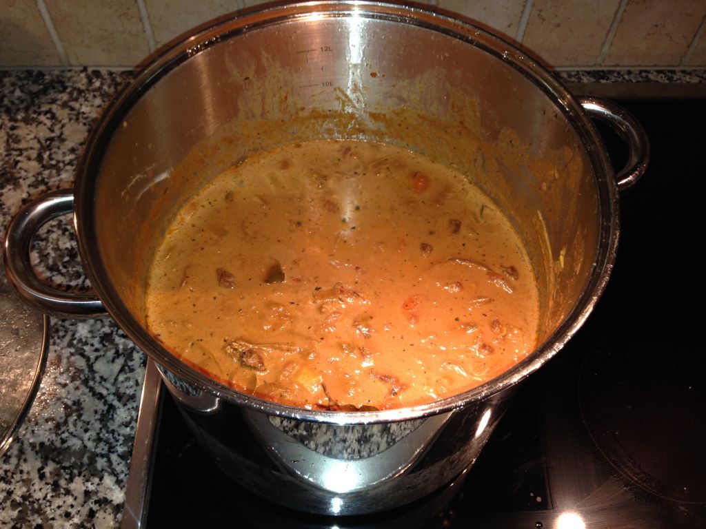 När allt är klart har 3 kg kött med olika rotfrukter, kryddor och mejeriprodukter blivit drygt 7L gryta. Det blir middag i kväll plus matlåda och 4 x 1.5L burkar att frysa in.