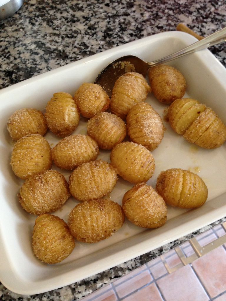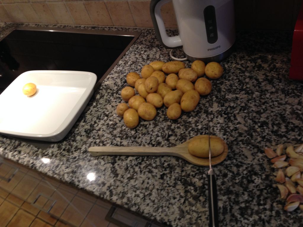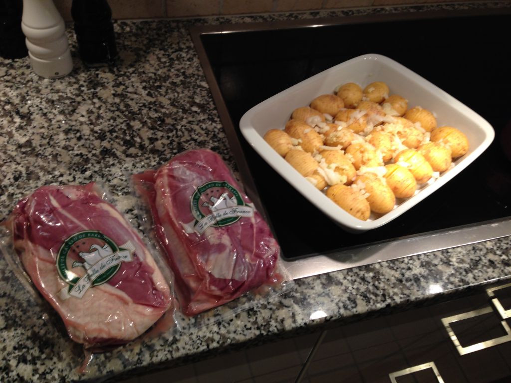 Potatisen penslas en gång till efter 2/3 av tiden och man strör på ströbröd. Ankan är klar mellan 55-60 grader. Termometern på 56 och sedan får den vila ca 15-20 minuter under folie blir bra med bröst.