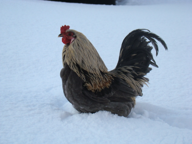 Min tupp Mango blir överlycklig när jag äntligen öppnar dörren till hönshuset. Han tar sats och flaxar ut. Men vad är nu detta? Det är en massa vit gegga över hela gräsmattan! Mango som är född i somras har ju aldrig sett snö förut. Så där stod han skräckslagen mitt i det vita och undrade var han hamnat. Det slutade med att jag fick gå och hämta honom... xD