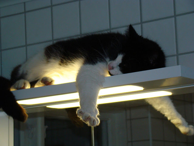 Man kommer in i badrummet och får syn på att katten ligger... uppe på lampan, över handfatet... Men jag får erkänna att det såg ganska mysigt ut!