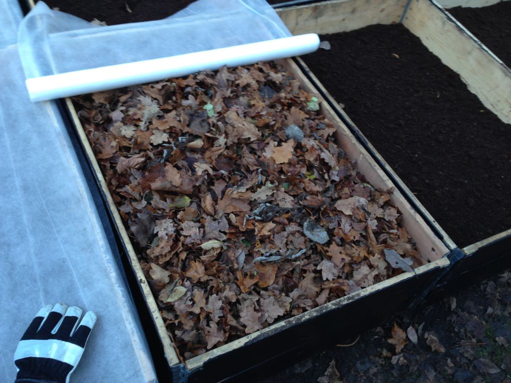 När vitlöken satts och täcks med löv så häftar jag på ett dubbel lager fiberduk.
